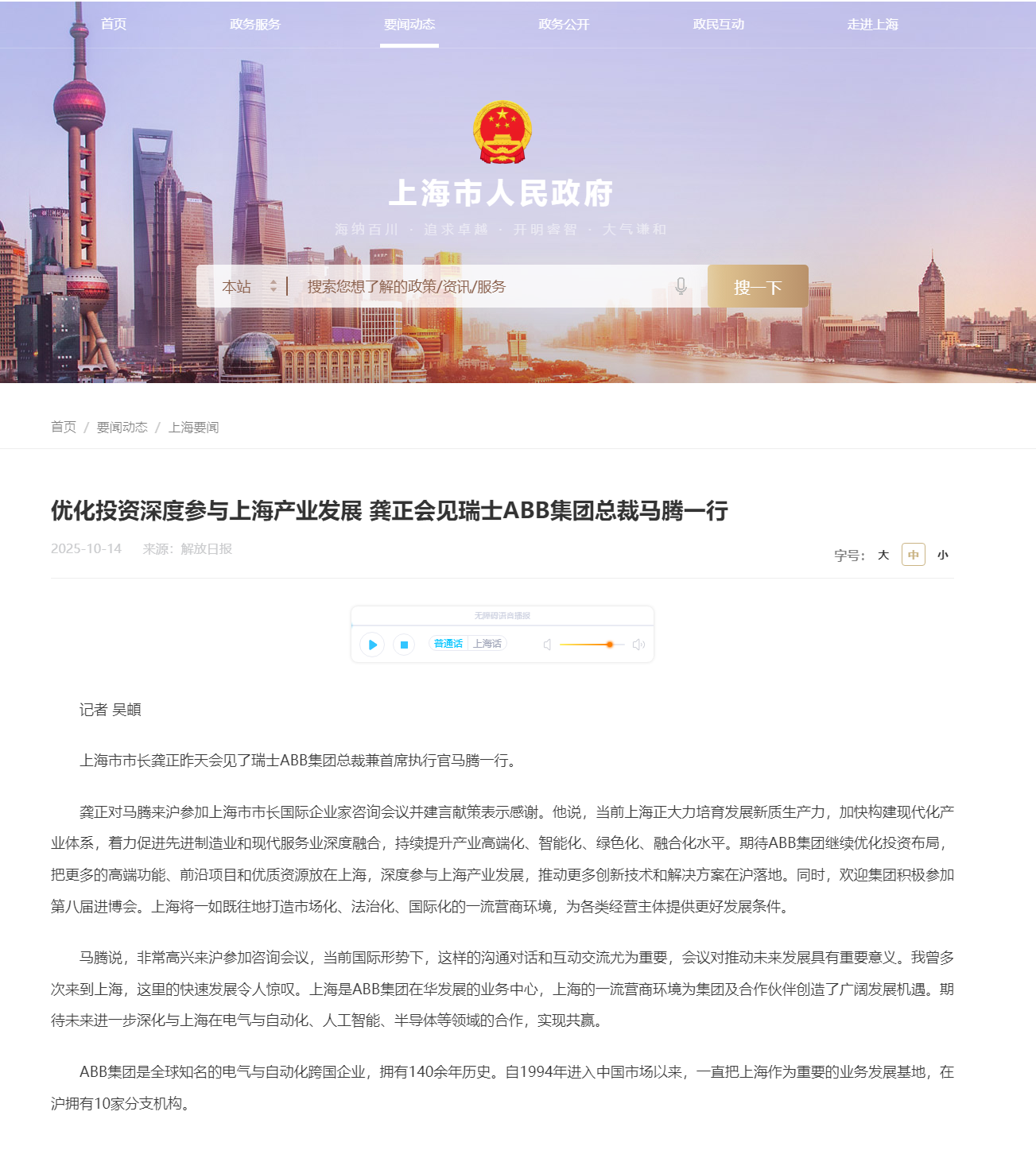 优化投资深度参与上海产业发展 龚正会见瑞士ABB集团总裁马腾一行