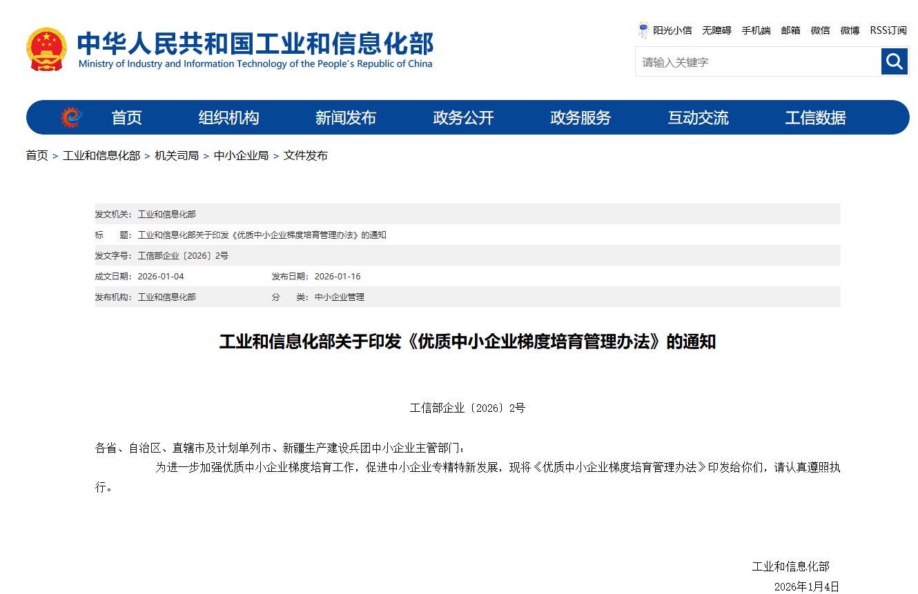 工业和信息化部中小企业局有关负责人介绍,《办法》进一步健全优质中小企业梯度培育体系,引导企业持续提升发展质量,指导地方健全优质企业主动发现机制、强化培育服务和动态管理。