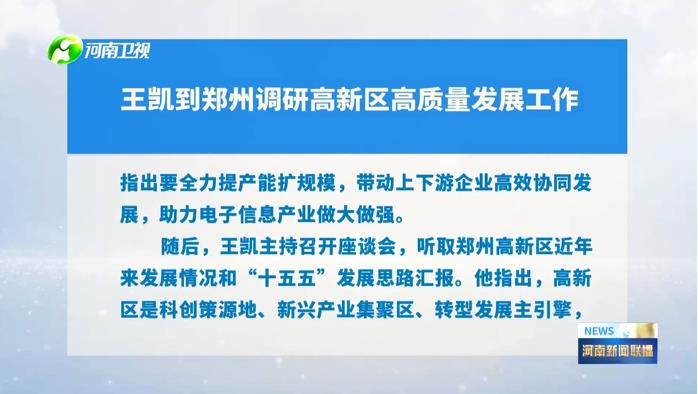 随后,王凯主持召开座谈会,听取郑州高新区近年来发展情况和“十五五”发展思路汇报。他指出,高新区是科创策源地、新兴产业集聚区、转型发展主引擎,在构建现代化产业体系中发挥着重要作用。要深入学习贯彻习近平总书记在河南考察时重要讲话精神,认真落实省委工作部署,聚焦“1+2+4+N”目标任务体系,牢固树立和践行正确政绩观,准确把握发展大势和产业演进规律,进一步明晰功能定位、发展方向、重点任务,持续深化改革、扩大开放,因地制宜发展新质生产力,不断提升产业实力、创新能力和管理水平,为全省经济高质量发展提供有力支撑。