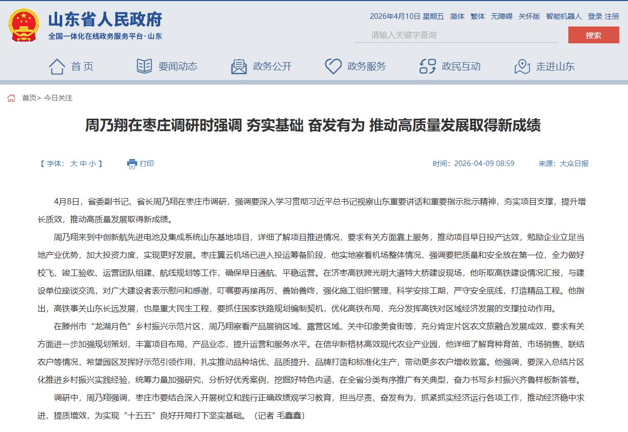 4月8日,山东省委副书记、省长周乃翔在枣庄市调研,强调要深入学习贯彻习近平总书记视察山东重要讲话和重要指示批示精神,夯实项目支撑,提升增长质效,推动高质量发展取得新成绩。