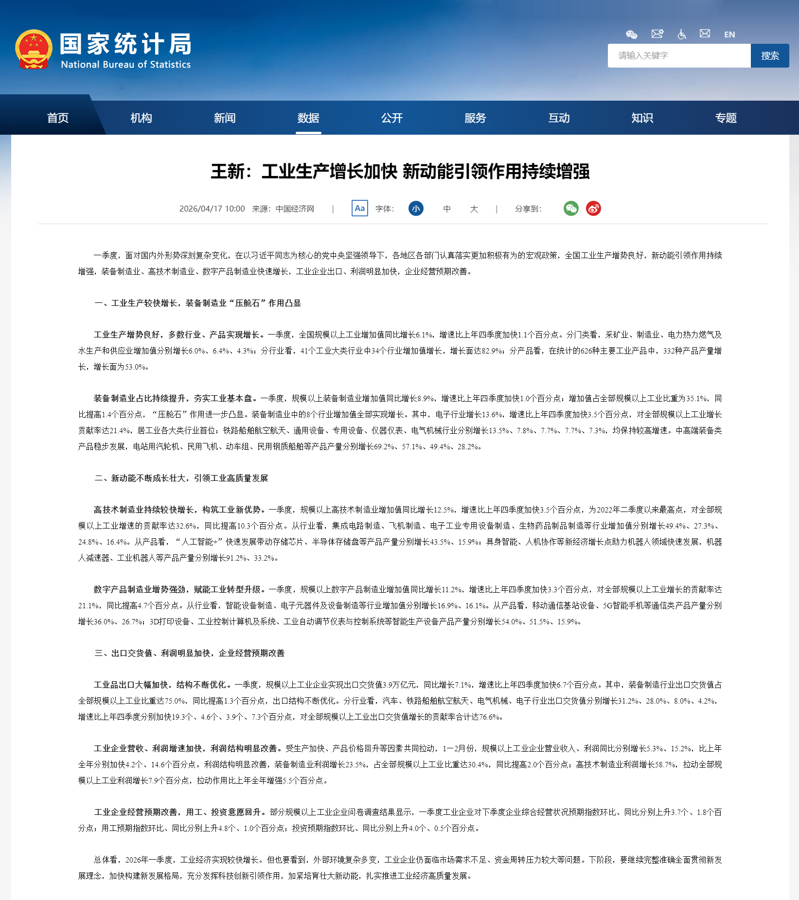 一季度,面对国内外形势深刻复杂变化,在以习近平同志为核心的党中央坚强领导下,各地区各部门认真落实更加积极有为的宏观政策,全国工业生产增势良好,新动能引领作用持续增强,装备制造业、高技术制造业、数字产品制造业快速增长,工业企业出口、利润明显加快,企业经营预期改善。