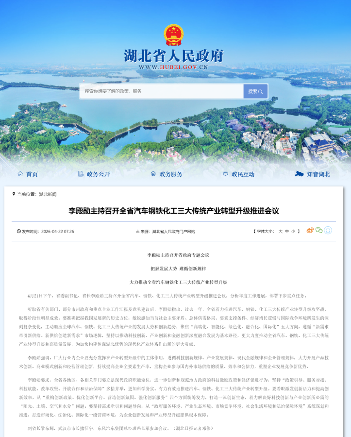听取省有关部门、部分市州政府和重点企业工作汇报及意见建议后,李殿勋指出,过去一年,全省着力推进汽车、钢铁、化工三大传统产业转型升级攻坚战,取得阶段性明显成效。要准确把握我国发展新的历史方位,敏锐感知当前社会主要矛盾、总体供需格局、要素支撑条件、经济增长逻辑与国际竞争环境所发生的深刻复杂变化,主动顺应全球汽车、钢铁、化工三大传统产业的发展大势和创新趋势,聚焦“高端化、智能化、绿色化、融合化、国际化”五大方向,遵循“新需求牵引新供给、新供给创造新需求”市场逻辑,坚持以推动科技创新、产业创新和金融创新深度融合发展为基本路径,更大力度推动全省汽车、钢铁、化工三大传统产业转型升级和高质量发展,为加快构建体现湖北优势的现代化产业体系作出新的更大贡献。