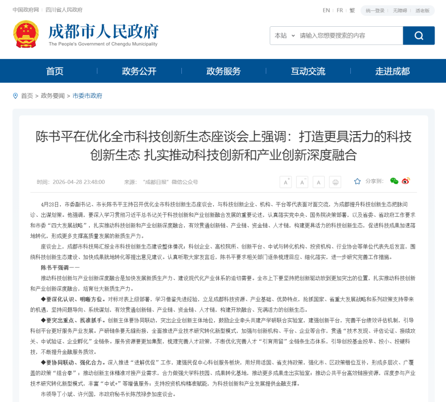 4月28日,成都市委副书记、市长陈书平主持召开优化全市科技创新生态座谈会,与科技创新企业、机构、平台等代表面对面交流,为成都提升科技创新生态把脉问诊、出谋划策。他强调,要深入学习贯彻习近平总书记关于科技创新和产业创新融合发展的重要论述,认真落实党中央、国务院决策部署,以及省委、省政府工作要求和市委“四大发展战略”,扎实推动科技创新和产业创新深度融合,有效贯通创新链、产业链、资金链、人才链,构建更具活力的科技创新生态,促进科技成果加速落地转化,形成更多支撑高质量发展的新质生产力。